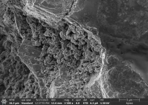 🌿 Wood-Based vs. Coal-Based: Take a closer look at the difference in our activated carbon! On the left, the wood-based activated carbon’s surface is a mystery even under 3,500-fold magnification. In the lower right part of the image, the features are almost “gravelly.”